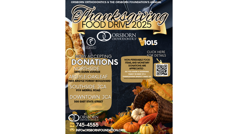 Join The Orsborn Foundation and Orsborn Orthodontics, in partnership with V101.5, as we collect non-perishable food items and monetary donations to help local families enjoy a warm Thanksgiving meal.